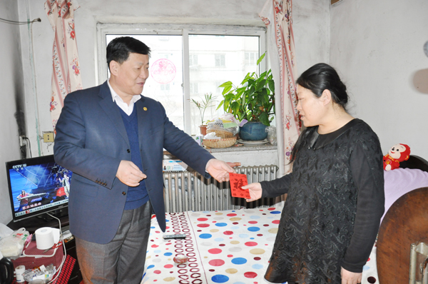 接着朱总一行又到包装公司张博君家看望,张博君幼年父亲去世,母子二人相依为命,终于成年开始工作赚钱养家,前年母亲却突患尿毒症,使这个家庭雪上加霜,公司及时送去1.5万爱心基金帮助这个家庭渡过难关,今年朱总及各级领导的再次到来,张博君的母亲一再感谢,并祝各位领导春节快乐。