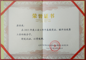 本报讯 近日,为表彰各工会干部在2015年度工会工作中的表现,激发他们的积极性,主动性和创造性,宏伟区总工会和各街道工会表彰了一批“优秀工会工作者”和“工会积极分子”。奥克集团工会干事孙艳芝被宏伟区总工会授予:2015年度“优秀工会工作者”荣誉称号;集团职能中心工会委员白洪良被长征街道工会授予:2015年度“优秀工会工作者”荣誉称号;药辅公司工会委员唐浩爽被长征街道工会授予:2015年度“工会积极分子”荣誉称号。此次表彰是对奥克工会工作者的极大鼓励和肯定,将会进一步促进奥克的工会工作者更加履职尽责,努力为职工服务,做好职工的“娘家人”。             (党群部  孙艳芝)