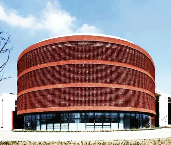 该研究成果源于异形非对称结构及大跨度预应力体系在千人报告厅施工技术的研究课题,主要应用在西安市创新港中学项目中的大报告厅工程,该报告厅可同时容纳1000人作学术汇报。该成果借助BIM三维建模、优化千人报告厅异形结构设计;采用后张法预应力技术解决大跨度混凝土结构、采用盘口架体搭设超高模板架体、外防护架采用斜拉式花篮悬挑架,解决异形曲面架体搭设问题、外墙采用清水陶土砖进行表面饰面。