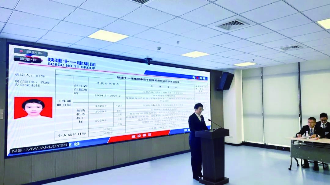 会上,新聘任的中层管理人员从工作履职目标、个人成长目标和廉洁从业目标进行公开承诺,承诺要求坚持高目标牵引和高绩效导向,聚焦关键核心任务,可量化、可衡量,其中工作履职目标分为奋斗者自愿承诺目标和契约化考核目标,契约化考核目标用于年度及任期考核,奋斗者自愿承诺目标是十一建人的奋斗者姿态和斗争精神的充分体现。