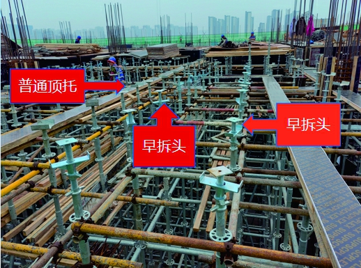 3、工序严谨,早拆体系的应用需要合理的策划和详细的交底,任何一步出现问题都有可能出现安全事故。通过早拆头和普通U顶搭配使用,普通部位全部拆除,早拆头部位只留架体和模板。最终实现预定目标。