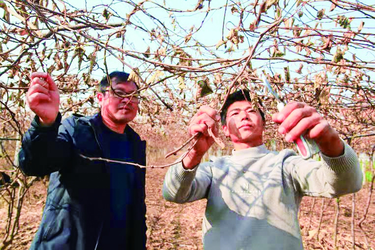 11月26日,在商水县邓城镇牛张庄村猕猴桃种植基地,“土专家”李东峰正向群众传授剪枝技术。入冬以来,该县积极引导种植、养殖等方面的“土专家”,深入田间地头向群众传授实用技术,帮助他们依靠技术增收致富。 刘飞摄