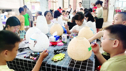 孩子与家长动手在灯笼上绘制图案