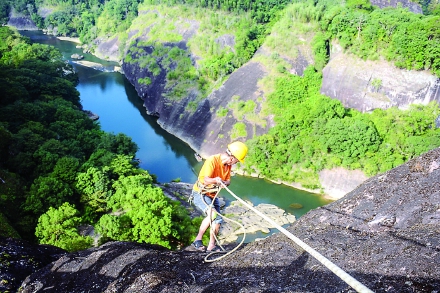 天游峰海拔408米,888级台阶蜿蜒向上,约330米路程。衷树贵每天都要登山巡查三遍以上,轻车就熟的他,半小时就能走一趟来回。当游客沉醉于奇峰兀立、云雾缭绕的丹山碧水间时,他正扛着10余公斤重的安全绳和锁具等装备,在悬崖间“行走”,一次又一次放绳、清理、收绳,动作循环往复,风雨无阻。