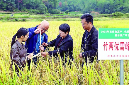 10月23日,武夷山市2025年优质稻新品种示范推广现场观摩会在崇安街道来福农场举行。全市农技人员、种粮大户等40余人齐聚田间,通过现场品比与交流,深入了解各品种特性,为科学选种、提升稻米品质打下坚实基础。 (邱汝泉摄)