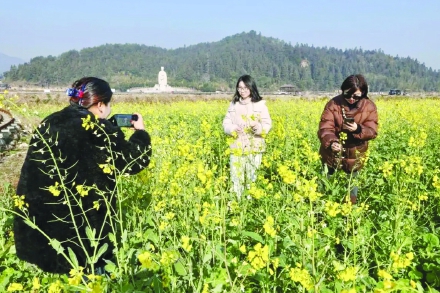 1月11日,游人在五夫镇盛开的油菜花海中赏花拍照。近日,五夫镇武夷山稻香生态农业科技发展有限公司种植的早熟油菜品种花盛开,引得游人纷纷驻足,赴这场提前盛开的花的盛宴。游人在油菜花海中游览拍照,享受冬季暖阳下的花季。