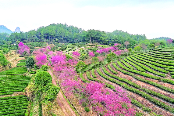 近日,位于武夷山的仙茗生态茶园里新茶吐绿、樱花盛开,红绿相间的早春美景,是游人赏花踏青的好去处。