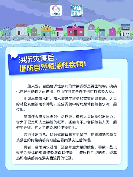 连日来,我市持续降雨,暴雨洪灾过后,各种传染病疫情,特别是肠道传染病、虫媒和自然疫源性传染病发生风险增加,洪涝灾害后健康防病应注意以下几点: