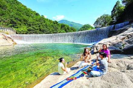 右图:7月11日,星村镇村民在溪水边摆茶席,享受茶乡慢生活。 (新华社陈颖摄)