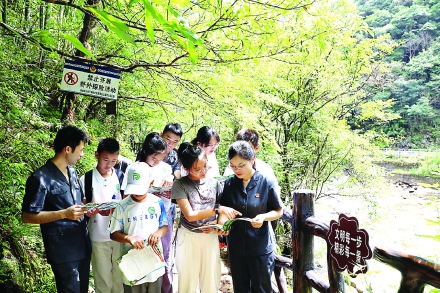 8月15日,武夷山法院联合共青团武夷山市委员会、武夷山国家公园科研监测中心共同开展“行走环带,探秘生态武夷”走进武夷山国家公园自然教育活动,引导30位中小学生当好生态巡护员。在桃源峪,法官通过讲解武夷山国家公园内的典型案事例给少年们上了一节生动的普法课,将生态环境保护理念融入生活。(谢泽语饶崇文摄)