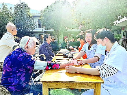 10月11日上午,五夫镇联合五夫商会、五夫镇卫生院到辖区敬老院开展重阳节慰问活动。卫生院组织健康团队为老人们免费测量血压、心肺听诊、开展健康评估及用药指导等,商会成员则为老人们分发牛奶、面包等慰问品。 (钟倩摄)