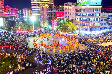 元宵佳节,武夷山市区人头攒动、热闹非凡,一场场极具传统韵味的舞龙活动吸引众多市民与游客前来,共赴民俗文化盛宴。 (肖文凤摄)
