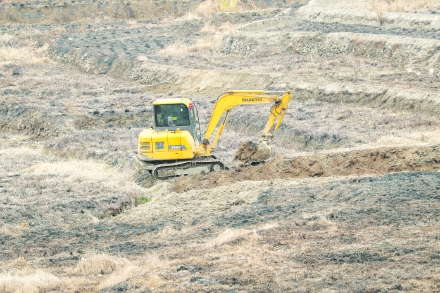 ◀2月26日,挖掘机在吴屯乡大浑村一处撂荒地开挖沟渠、平整土地。吴屯乡种粮大户赵亮亮对开垦撂荒地种粮别有情怀,去冬今春已在大际村、大浑村三处山垅田开垦撂荒地216亩,准备全部种上水稻。(邱汝泉摄)