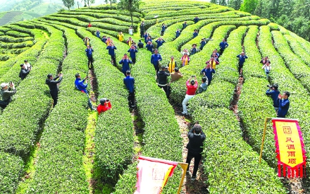 4月13日,星村镇朝阳村茶农在生态茶园喊山“采茶咯”。采茶季来临,朝阳村茶农在生态茶园举行第十届祭茶喊山民俗文化活动。