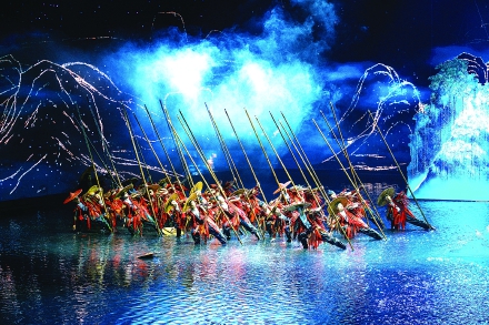 在《月映武夷》,水舞台可实现干湿瞬间切换,一秒前还是坚实的表演区域,瞬间就能化为一湾碧水,配合雾森装置,水面云雾缭绕,营