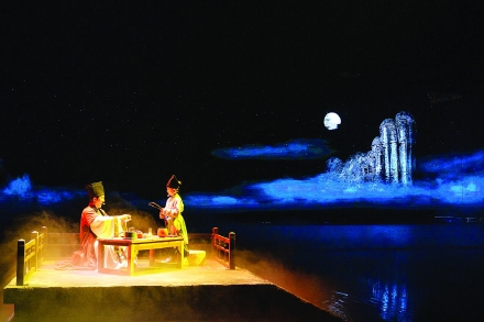 当舞台上的水元素与光影相互配合,雨水、溪水、酒水、茶水、泪水交织,象征着思想的汇聚与碰撞……