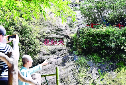 6月25日,游客在福建武夷山风景名胜区参观生长在武夷山九龙窠高岩峭壁上的大红袍茶树母株。