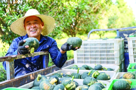 日前,武夷山辰粤农业发展有限公司员工在展示刚刚采摘的贝贝南瓜。位于兴田镇的武夷山辰粤农业发展有限公司以“公司+农户”的形式,在撂荒地里种植绿色有机贝贝南瓜,如今贝贝南瓜喜获丰收,甜蜜小南瓜变身致富“金疙瘩”,带动村民增收致富。 (邱汝泉 张威威摄)