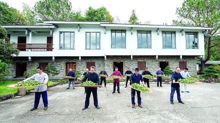 武夷岩茶(大红袍)制作技艺传承人展示摇青技艺。(王震潭摄)