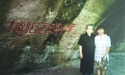 1995年李友邦夫人严秀峰女士在“打倒日寇,保我中华”摩崖石刻下的留影