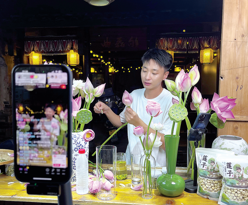 这个自称“五夫春春”的年轻人,三年前辞去城市高薪工作,回到以“朱子故里”“白莲之乡”闻名的故乡创业,曾面临乡亲们“为何回来种地”的不解。起步维艰,他承包的200亩荷塘首年便因水草疯长、阴雨影响授粉而收成惨淡。他转而尝试短视频带货,初期账号几乎无人问津,直播间最惨淡时仅有五人驻足。面对困境,他做好了亏损35万元的准备。转机发生在去年盛夏,一条没有刻意修饰的采荷视频意外走红:满屏荷花摇曳,清脆的折茎声与蝉鸣交织,播放量突破30万次。刘旭春由此触摸到流量密码--真实、自然,带着泥土的芬芳。