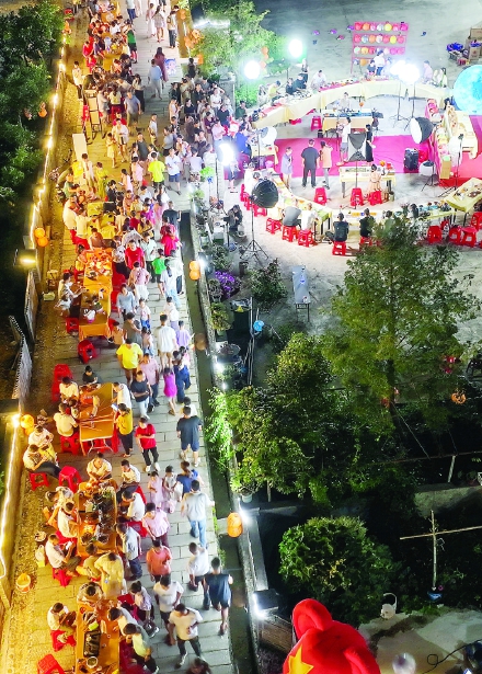 10月6日晚,农历八月十五中秋夜,星村镇黄村村举办百桌茶宴,游人与当地村民齐聚一堂,赏月、品茶、尝美食,共庆中秋佳节。(邱汝泉摄)
